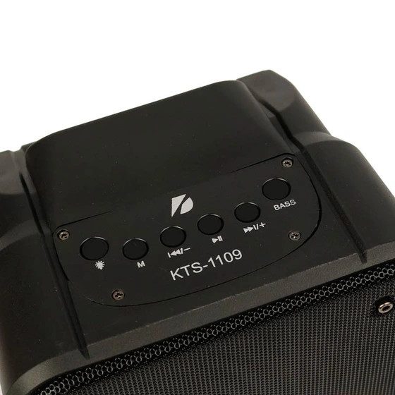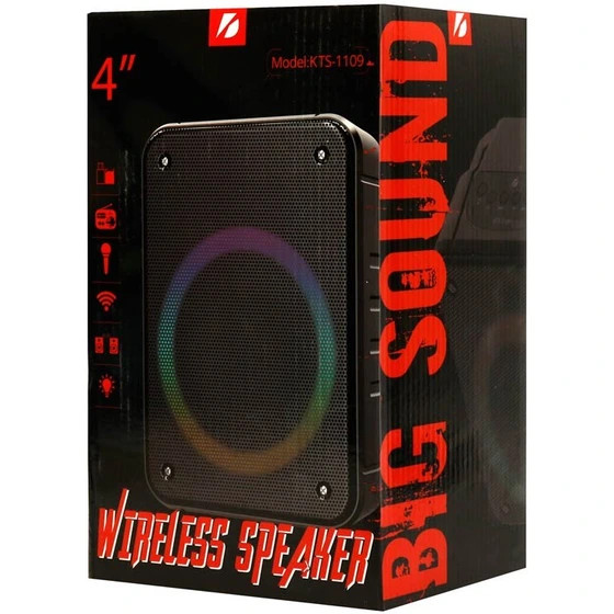 اسپیکر KTS-1109 از محصولات خوش ساخت و دارای بدنه ای مقاوم می باشد که از قدرت صدای خوبی برخوردار است. این دستگاه پخش کننده صوتی توسط بلوتوث به طور بی سیم به گوشی موبایل، تبلت، لپ تاپ و ... تا شعاع 10 متری بدون هیچ قطعی متصل می شود. همچنین روش های اتصال دیگری نظیر رابط جک صوتی 3٫5 میلی متری، پورت فلش مموری USB، شیار کارت حافظه رم میکرو SD و درگاه AUX نیز فراهم شده تا کاربر به دیگر فایل های صوتی خود دسترسی های بیشتر و راحت تری داشته باشد. نورپردازی RGB داخلی نیز برای این اسپیکر درنظر گرفته شده که جذابیت و زیبایی آن در هنگام پخش موسیقی را دو چندان خواهد کرد. یک سری دکمه فیزیکی در قسمت بالای پنل این دستگاه تعبیه شده تا به آسانی بتوانید میزان حجم صدا، پخش موسیقی، Mode، نورپردازی و ... را مدیریت نمایید. اسپیکر بلوتوثی رم و فلش خور KTS-1109 اسپیکر بی سیم قابل حمل مدل KTS1109 با ساب ووفر به قطر درایو 4 اینچی و توان خروجی 10 وات می تواند صدایی قدرتمند با وضوح فراگیر و رسا را به گوش برساند. این دستگاه با پشتیبانی از محدوده فرکانسی 100 هرتز تا 20 کیلو هرتز، حساسیت سیگنال به نویز 85 دسی بل قادر است طیف وسیعی از صداهای زیر و بم موسیقی را با بیس بالا و شفاف حتی در محیط های شلوغ پخش کند. یکی از ویژگی های کاربردی و خوب این اسپیکر مجهز بودن به ورودی میکروفون می باشد که علاوه بر ضبط صدا امکان استفاده در سخنرانی ها، مصاحبه ها، همخوانی با آهنگ، تمرین خوانندگی و ... را در اختیار کاربر قرار می دهد. قابلیت رادیو FM هم برای این دستگاه فراهم شده که بهترین کیفیت کانال ها را دریافت می کند تا برنامه های رادیویی را با بهترین قدرت صدایی و بدون نویز بشنوید. باتری داخلی لیتیومی با ظرفیت 1200 میلی آمپرساعت برای اسپیکر بلوتوثی رم و فلش خور KTS-1109 درنظر گرفته شده که توانایی پخش مداوم موسیقی تا حداکثر 2 ساعت را با بلندی صدای 75 درصد خواهد داشت، همچنین از طریق پورت تایپ سی که بر روی بدنه آن تعبیه شده امکان شارژ کامل باتری این دستگاه وجود دارد که 3 ساعت طول می کشد.